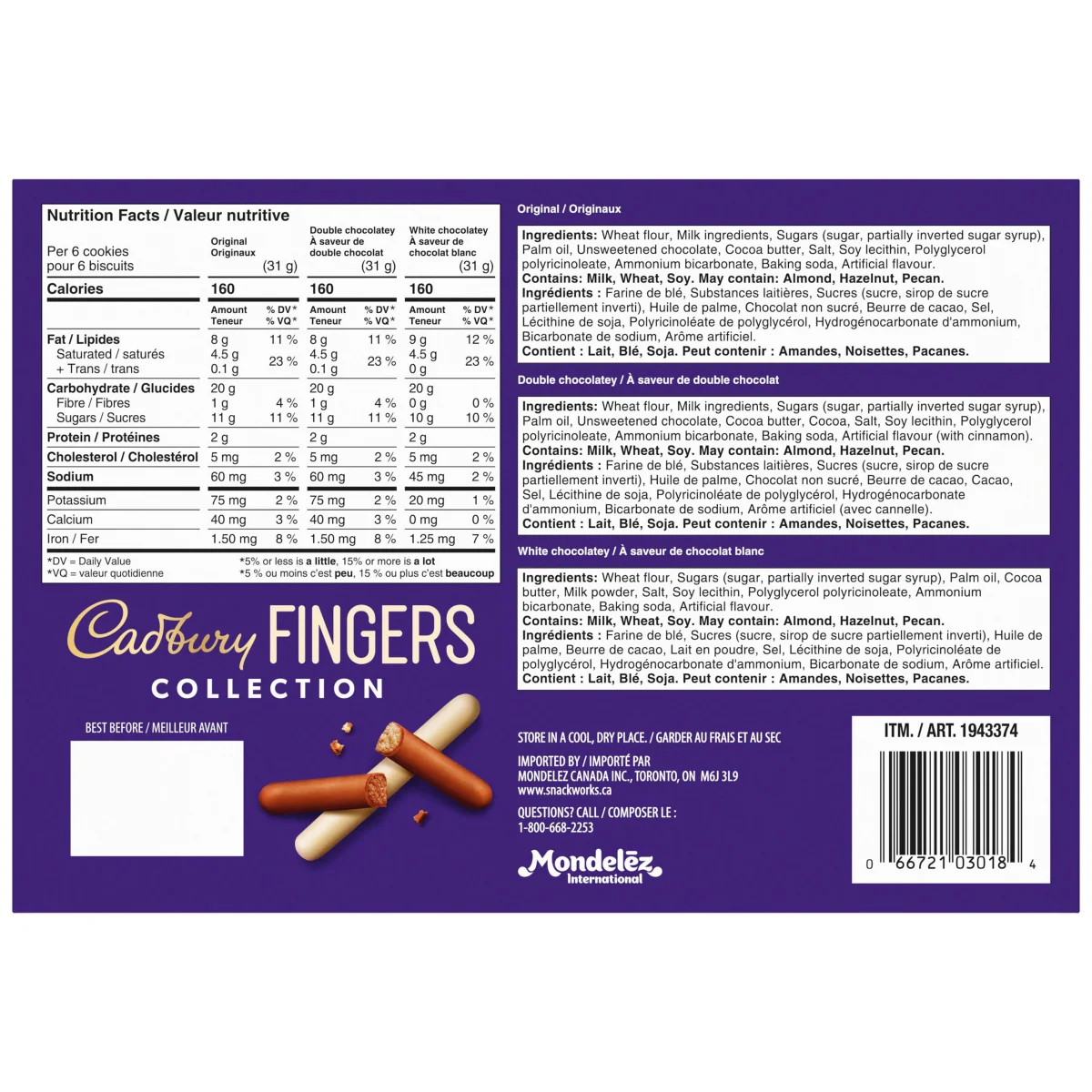 吉百利手指饼干礼盒,为您带来三种美味口味:原味、白巧克力味和双倍巧克力味,酥脆可口,巧克力涂层,令人垂涎。吉百利品质始终如一,美味饼干,吉百利爱好者不容错过!一盒三种口味,总有一款或三款让您爱不释手!这款礼盒是馈赠亲友、宴请宾客、与朋友分享或周末休闲的理想之选。无论是送给亲朋好友、同事还是老师,这款饼干都是节日礼物、感谢礼品等的完美之选!这些一口大小、手指形状、巧克力涂层的饼干,定会让您惊喜不已!