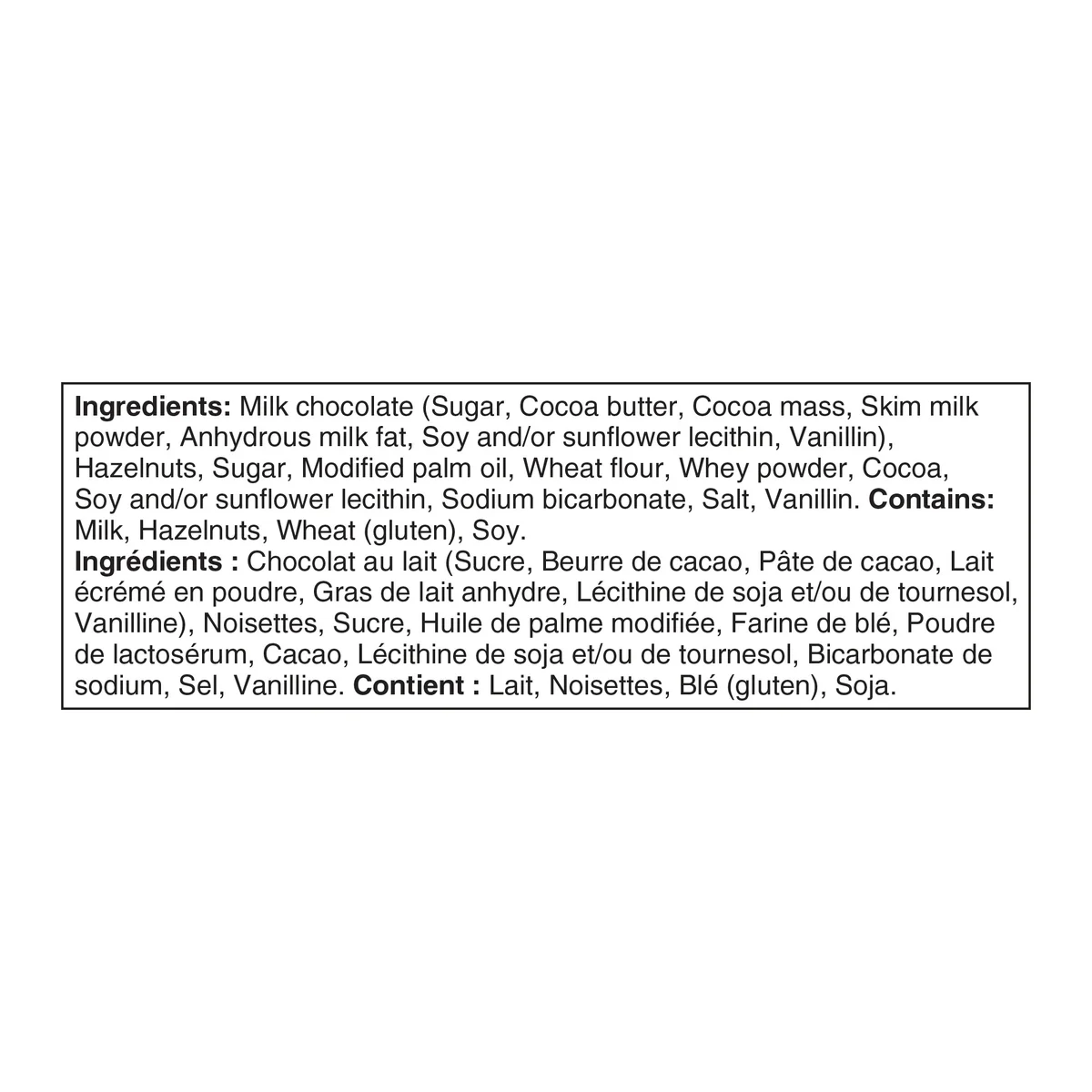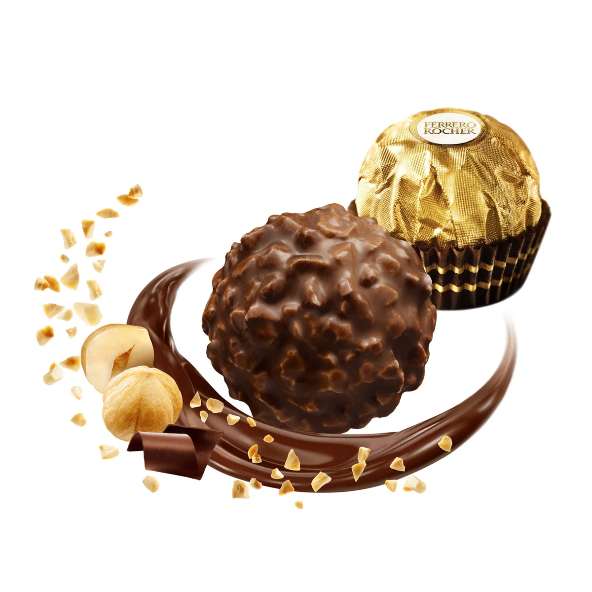 - 一整颗香脆的榛子,包裹在美味的奶油馅料中,全部包裹在酥脆的威化饼壳中,上面覆盖着牛奶巧克力和轻轻烤制的榛子碎