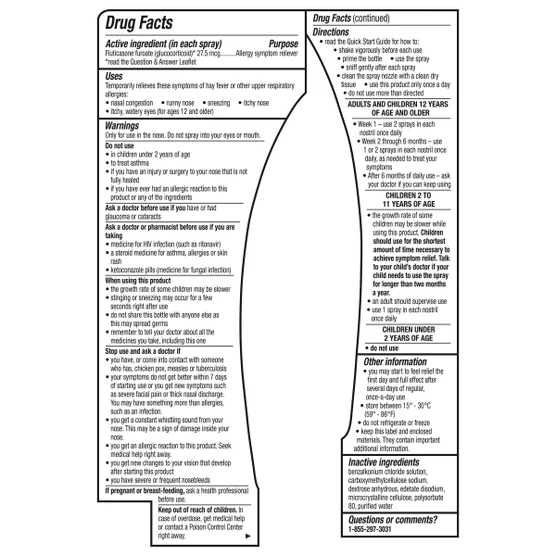 - 活性成分(每次喷雾含:糠酸氟替卡松 27.5 微克(糖皮质激素) – 缓解过敏症状。