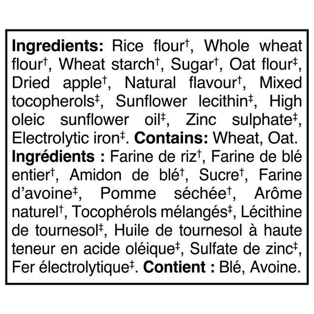 大米粉、全麦粉、小麦淀粉、白砂糖、燕麦粉、苹果干、天然香料、混合生育酚、葵花籽卵磷脂、高油酸葵花籽油、硫酸锌、电解铁。含:小麦、燕麦。源自非转基因(GE)原料。一如既往,仅提供非转基因原料。