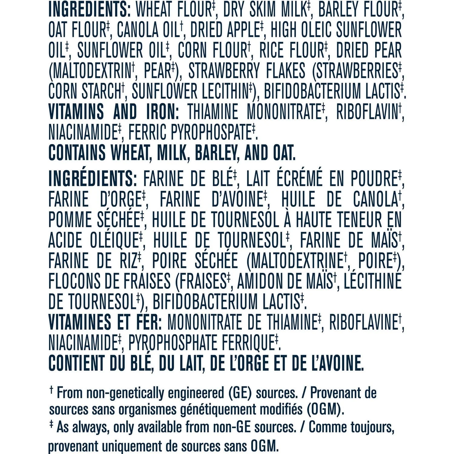 小麦粉、脱脂奶粉、大麦粉、燕麦粉、菜籽油、苹果干、高油酸葵花籽油、葵花籽油、玉米粉、大米粉、梨干(麦芽糊精、梨)、草莓片(草莓、玉米淀粉、葵花籽卵磷脂)、乳双歧杆菌。维生素和铁:硝酸硫胺素、核黄素、烟酰胺、焦磷酸铁。