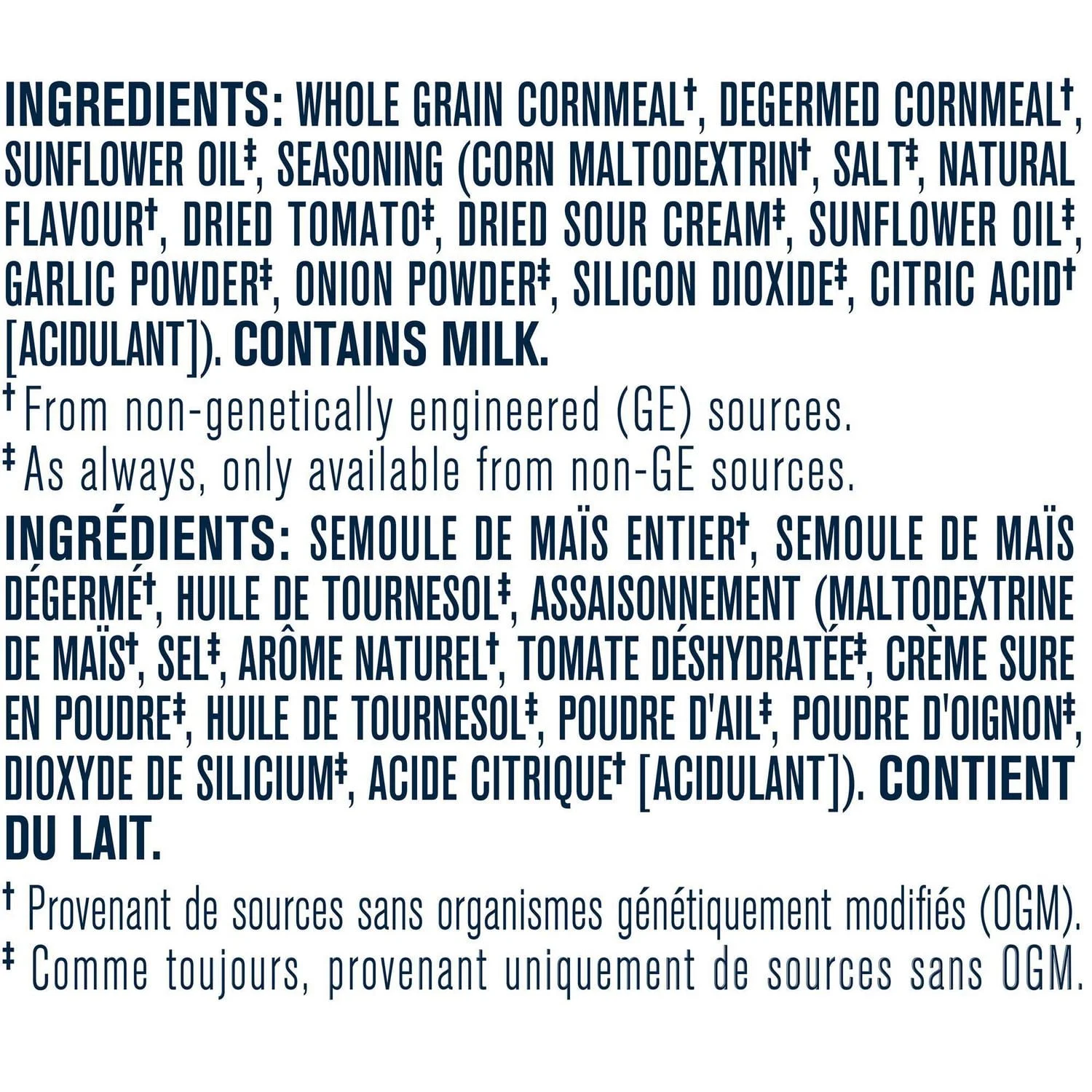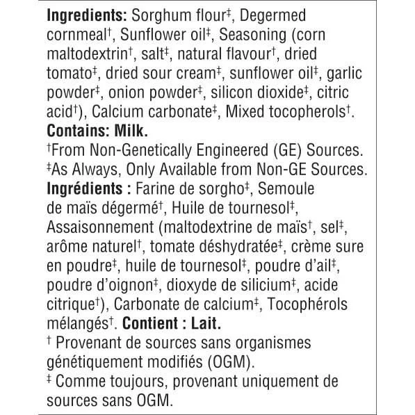 全谷物玉米粉、脱胚玉米粉、葵花籽油、调味料(玉米麦芽糊精、盐、天然香料、番茄干、酸奶油干、葵花籽油、大蒜粉、洋葱粉、二氧化硅、柠檬酸 [酸度调节剂])源自非转基因(Ge)来源。一如既往,仅提供非转基因来源。