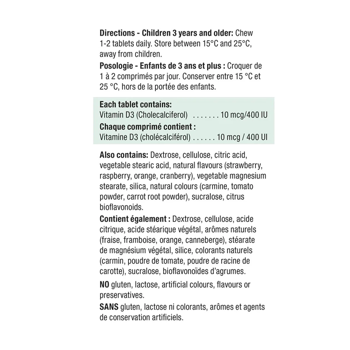 - 葡萄糖、纤维素、柠檬酸、植物硬脂酸、天然香料(草莓、覆盆子、橙子、蔓越莓)、植物硬脂酸镁、二氧化硅、天然色素(胭脂红、番茄粉、胡萝卜根粉)、三氯蔗糖、柑橘生物类黄酮。