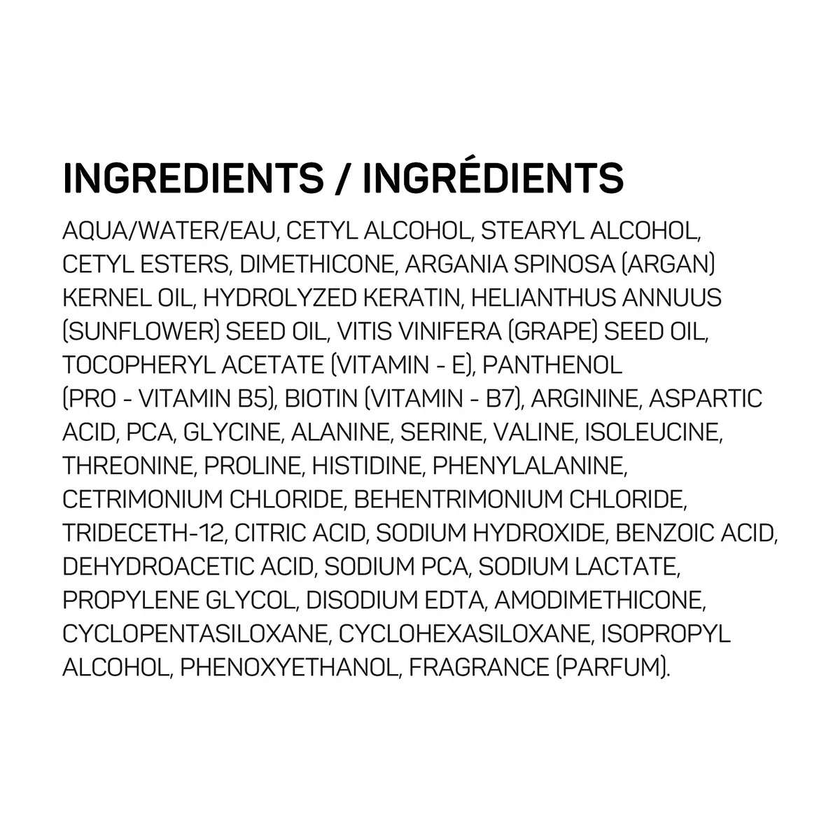 水/水/水、鲸蜡醇、硬脂醇、鲸蜡醇酯、聚二甲基硅氧烷、摩洛哥坚果仁油、水解角蛋白、向日葵籽油、葡萄籽油、生育酚乙酸酯(维生素E)、泛醇(维生素B5)、生物素(维生素B7)、精氨酸、天冬氨酸、PCA、甘氨酸、丙氨酸、丝氨酸、缬氨酸、异亮氨酸、苏氨酸、脯氨酸、组氨酸、苯丙氨酸、十六烷基三甲基氯化铵、山嵛基三甲基氯化铵、十三烷醇聚醚-12、柠檬酸、氢氧化钠、苯甲酸、脱氢乙酸、PCA钠、乳酸钠、丙二醇、乙二胺四乙酸二钠、氨端聚二甲基硅氧烷、环戊硅氧烷、环己硅氧烷、异丙醇、苯氧乙醇、香精