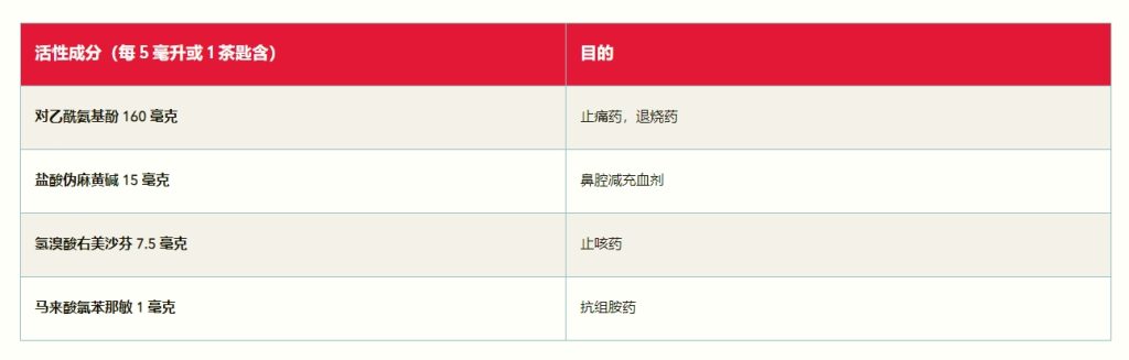 - 暂时缓解:轻度至中度疼痛、发烧和发冷、喉咙痛、鼻塞、干咳、流鼻涕和打喷嚏(由普通感冒引起)。